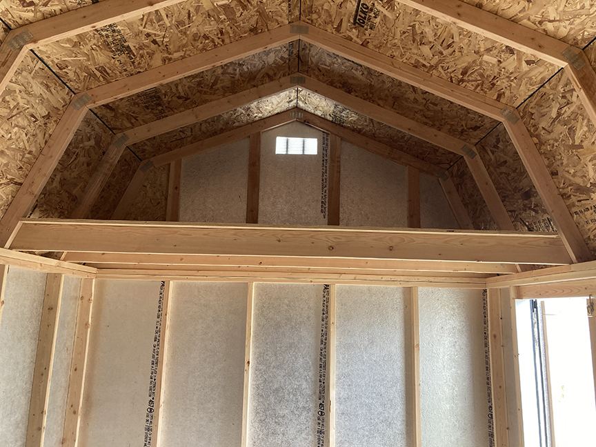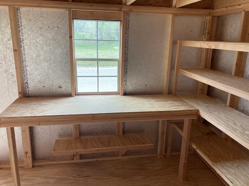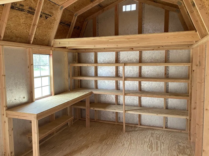Brand New 10’ x 16’ Loft Barn Shed, (4, not just 2) 4×6 ground contact skids, double top plate construction, 7/16 (not 3/8) LP 50 year Smart Siding,  Double Doors, double lofts, 1 Window w/ Shutters, Work Bench, 40’ of Shelves – Cash price $5,485 + sales tax.