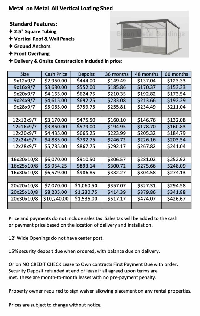 Note: Tack room is built inside of the shelter, for example a 12x20x9/7 would have 10′ of tack room and 10′ of animal shelter.